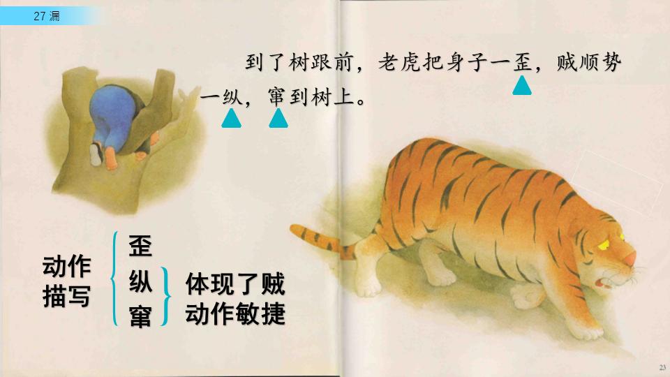 在整个故事中“漏 ”作为贯穿故事始终的一条主线,人物语言分别就是三句话:莫非‘漏’比我还厉害?“漏”真厉害。“漏”哇——三句话在三种不同的情境下,三次分别从贼和老虎的嘴里说出,一次比一次滑稽、一次比一次幽默、也一次又一次的将故事推向趣味的极致,体现故事的趣味性。