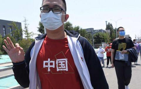 7月7日,北京二中通州校区考点,一位穿着印有“中国”字样T恤的考生走出考点。