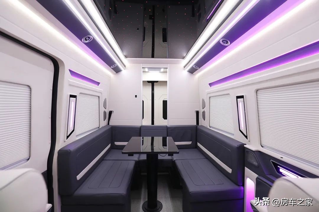 作为一款商旅型房车,隆翠旅行者的内饰要比我们以往看到的绝大多数商旅属性的房车都要好看,整个内饰都是按照商务车的风格来设计的,车顶是整块的星空顶,四周还有LED灯带装饰(可调节显示颜色),坐在车内会更能体会到这种装饰带来的愉悦感。布局方面,采用的是前置双人航空座椅,中置U型沙发会客区,车尾是独立的厨卫区域。前后没有遮挡,这种布局带来的纵深感非常强烈,色彩和灯光的搭配也确实非常的吸睛。