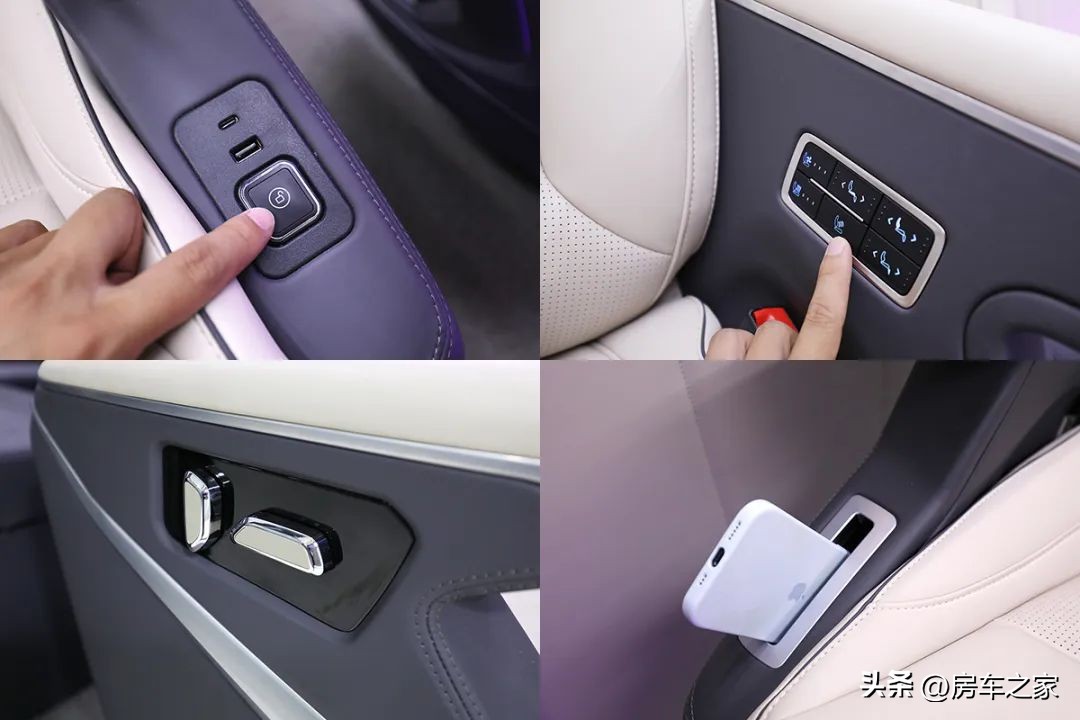这款车安装的航空座椅在乘坐的舒适性上,皮质的触感上,功能的设计上要比一般的航空座椅更好,靠背和坐垫非常厚实,两侧都有扶手,功能性的操作依赖于内侧的按键式控制面板和最外侧的镀铬按键。支持4向调节,带有通风/加热功能,还有腿托和USB/type-C充电接口,甚至是手机的临时存放槽。这两张航空座椅支持向后180度旋转,操作也十分便捷用手一直按压“P”按键,用手轻推就能完成旋转。
