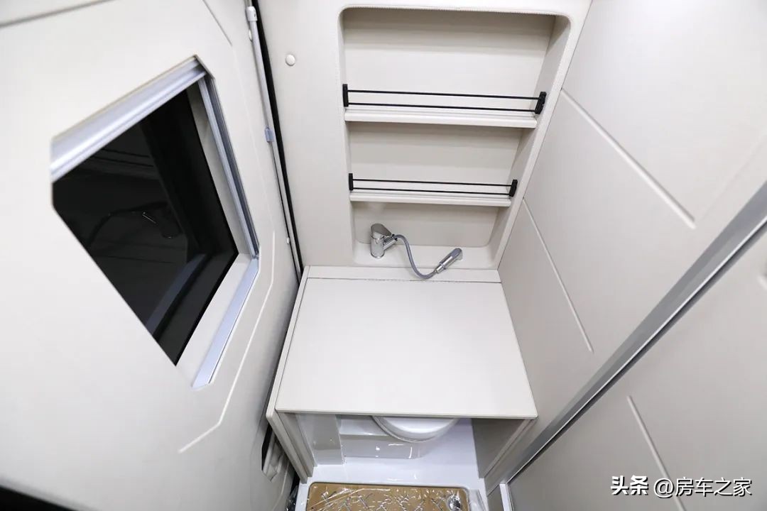打开车尾门,车尾部分是独立于生活区的厨卫区,包含了马桶、淋浴花洒和厨房操作台等等基础设施。对开门两侧的门板为皮质包覆,并且还给用户提供了两个开放式的储物格。
