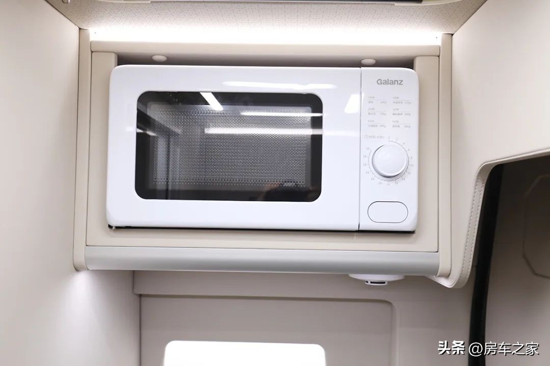 作为商旅房车而言,商务出行的属性为最先考虑的事情,而其他部分则相对比较弱化,比如这款房车的后置厨卫较之其他B型房车就要弱化一些。搭配的是一款紧凑级的厨房。厨房设备倒是很齐全,比如带玻璃盖板的洗菜池,方形电磁炉,还有一款沧浪牌50升冰箱,格兰仕的微波炉。日常在车内煮面,烧水,做个少油烟的简餐自然不是什么大的问题。