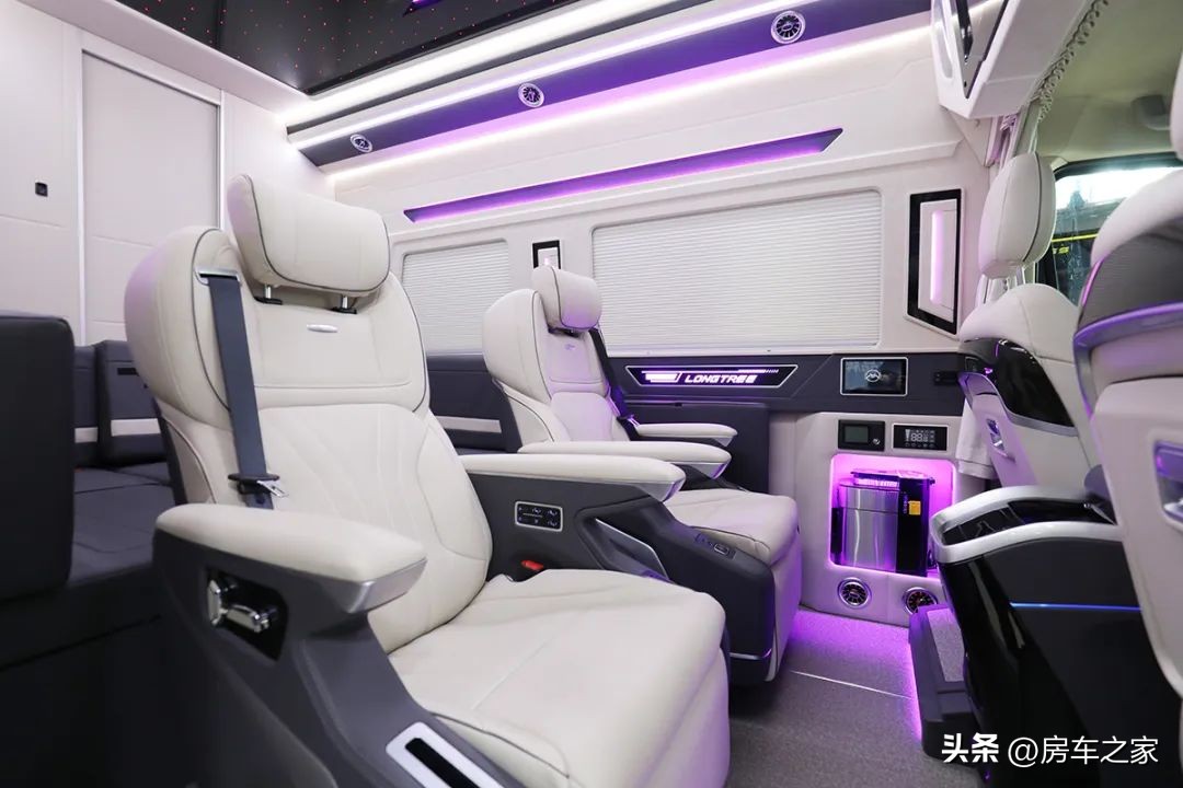 内饰中还有一些展示厂家logo的地方,比如航空座椅旁边的“LONGTREE”灯带。后方生活区的空调出风口也是商务车常用的涡轮形状的镀铬装饰件,精致细腻。