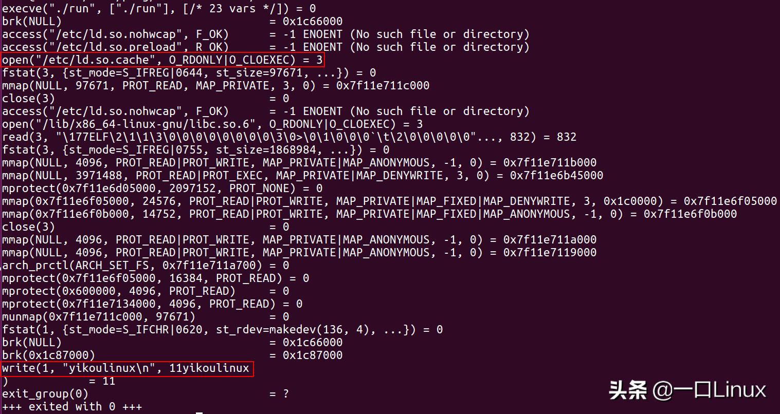 如执行结果可知: 我们的程序虽然只有一个printf函数,但是在执行过程中,我们前后调用了execve、access、open、fstat、mmap、brk、write等系统调用。 其中write系统调用会把字符串:yikoulinux通过设备文件1,发送到驱动,该设备节点对应终端stdout。