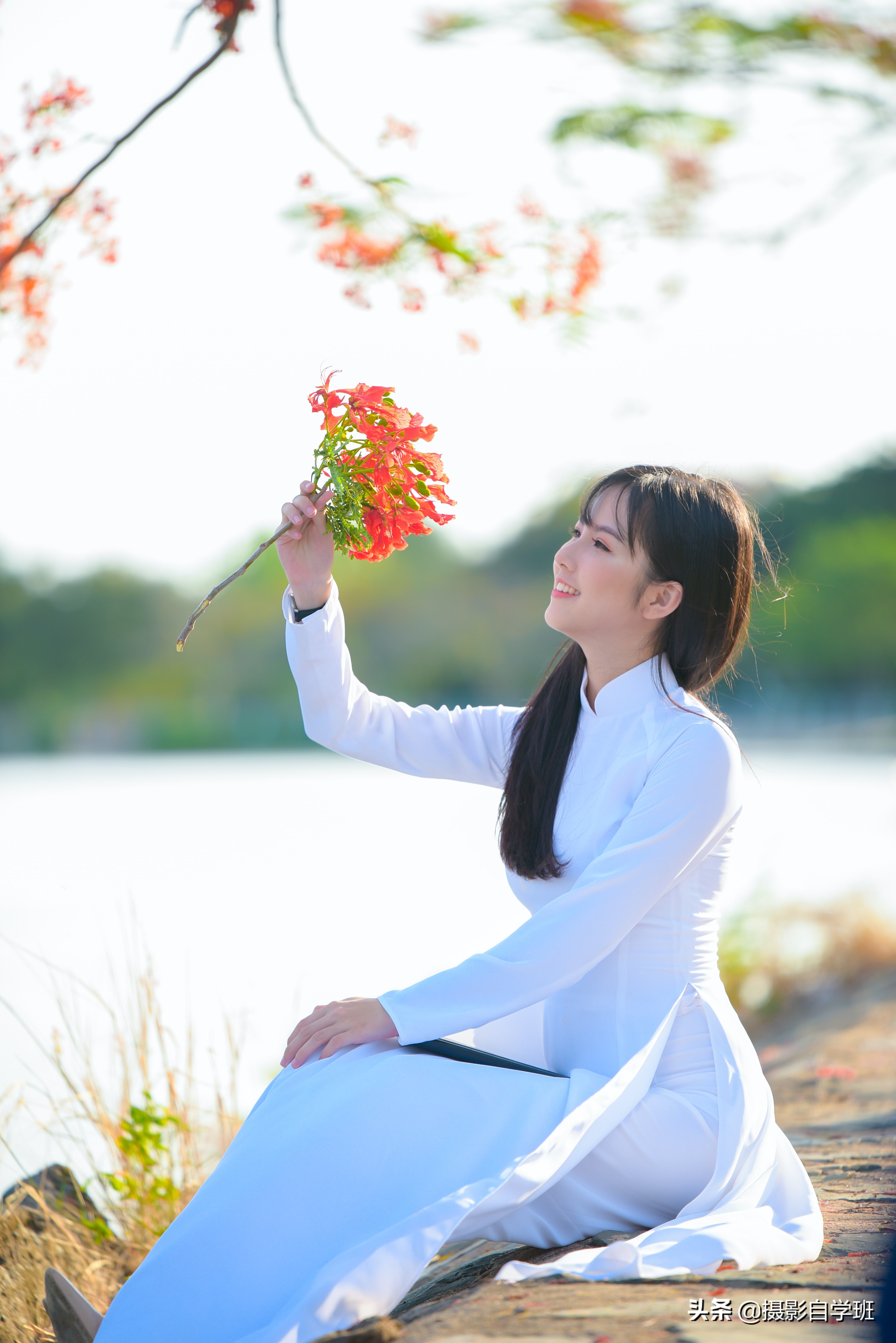 避开背景线条的方法很简单,摄影师调整一个角度或者上下调整一个机位,就可以改变背景横线的位置,同时,让被拍摄的人手中拿着花朵,看向花朵的姿势,坐着拍,也很美丽。