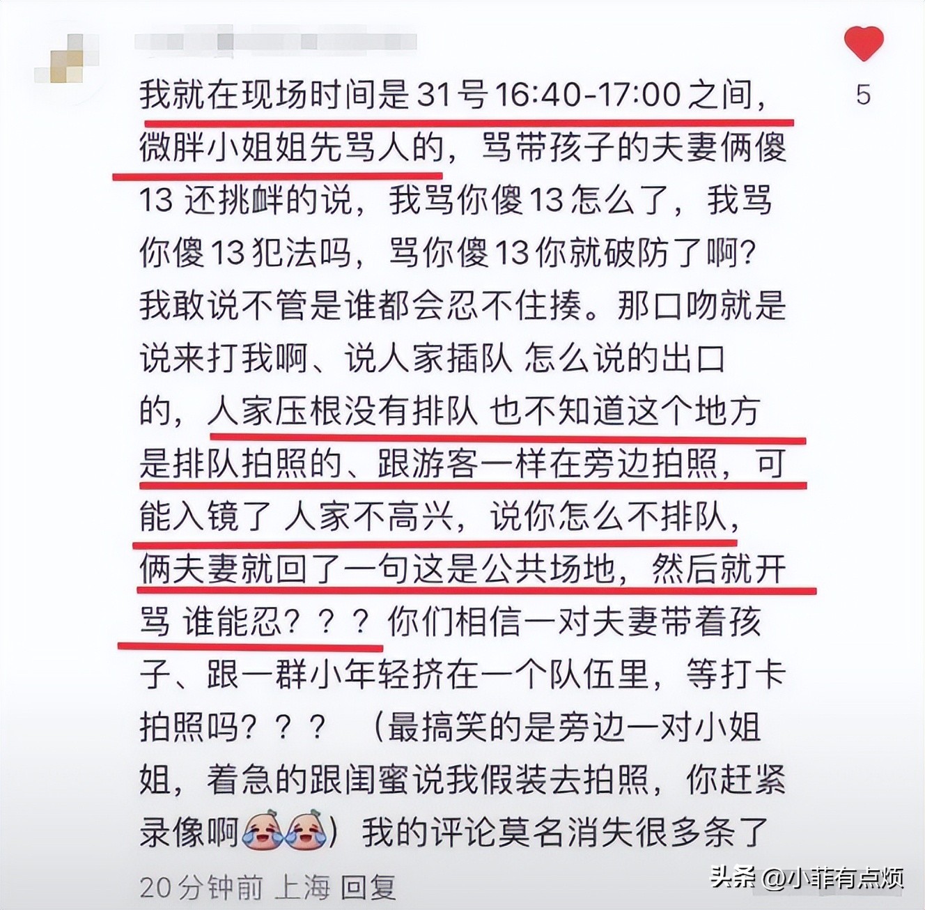 不过通过网络发声还原的情形显示,格子衫女子的反应异常激烈且直接。多位现场游客在后续网络讨论中提及,其言语极具攻击性和侮辱性,据称直接冲着刘某某夫妻斥骂了极其难听的词汇“傻13”。