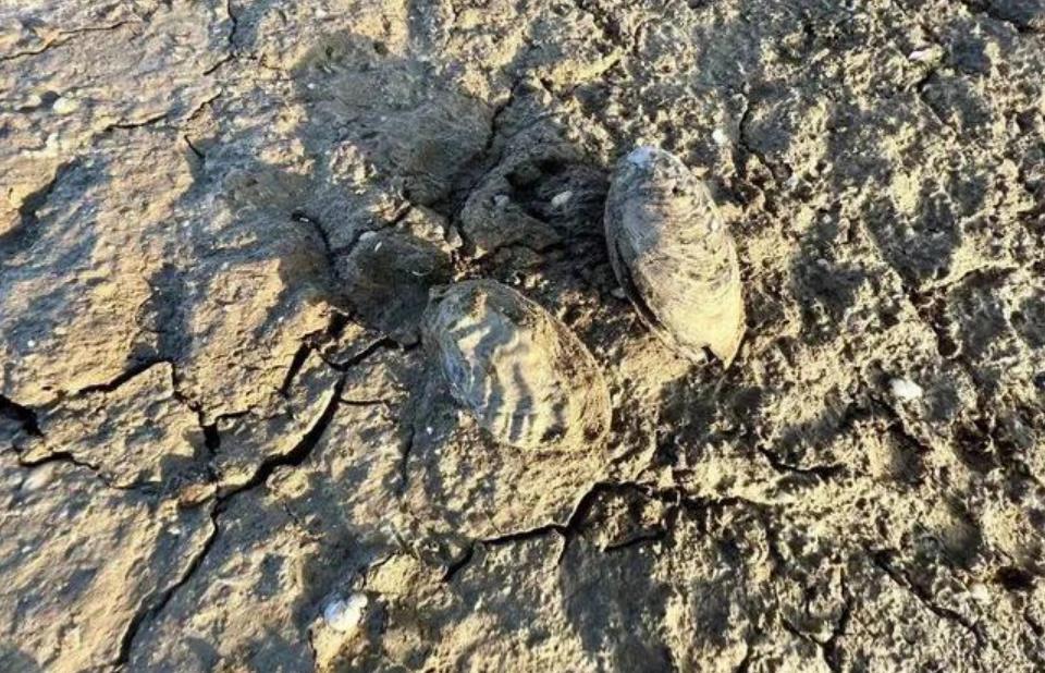 2022年,鄱阳湖流域遭受重大干旱,湖水水位降低,露出大片干涸龟裂的河床,而河床上则铺满了死亡的河蚌。