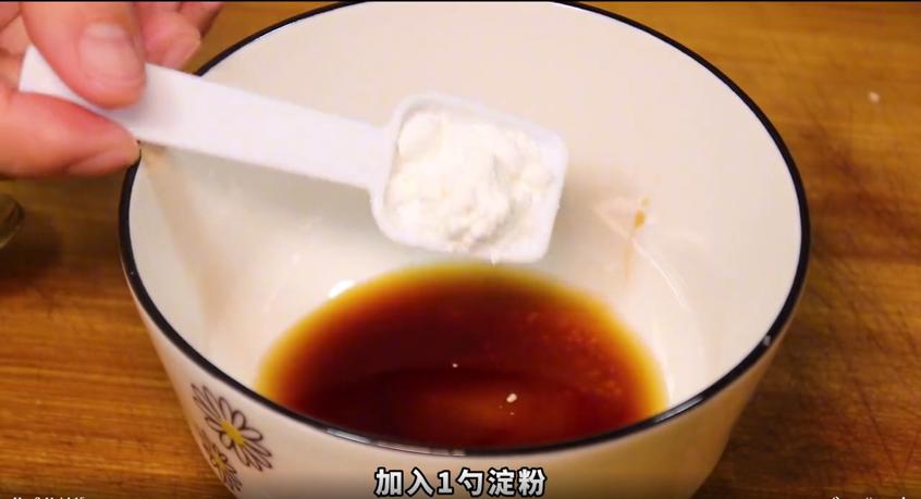 5.准备一个空碗用来调料汁,加两勺生抽、一勺料酒、一勺食盐、一勺淀粉、少许白砂糖,然后将所有的调料充分搅拌均匀,以待备用。