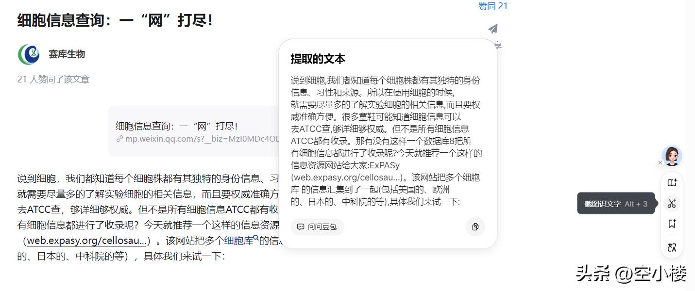 悬浮在网页侧边的豆包头像点一下还具有截图识别文字的功能!免费OCR工具哦~
