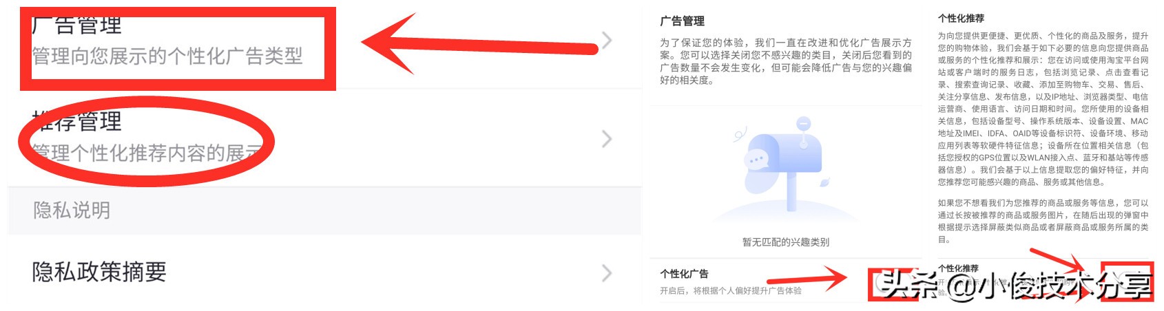 那么第二个呢,我们需要把淘宝的【个性化推荐】和【个性化广告】开关关闭!为什么要关掉呢?大家都知道,在这个大数据时代,很多APP为了给用户提供更加个性化的服务,因此都会监听我们的行为操作,从而实现向我们提供更加方便快速的服务,比如淘宝就拥有这些贴心功能,可以从我们的购物记录中通过【个性化推荐】和【个性化广告】这2个功能,向我们推荐相关的相同类型的产品和产品相关个性化广告,因此我们要把它们关掉!关闭方法也非常简单,只要在隐私设置里面找到【广告管理】和【推荐管理】,然后把相应的广告开关关掉就行了!
