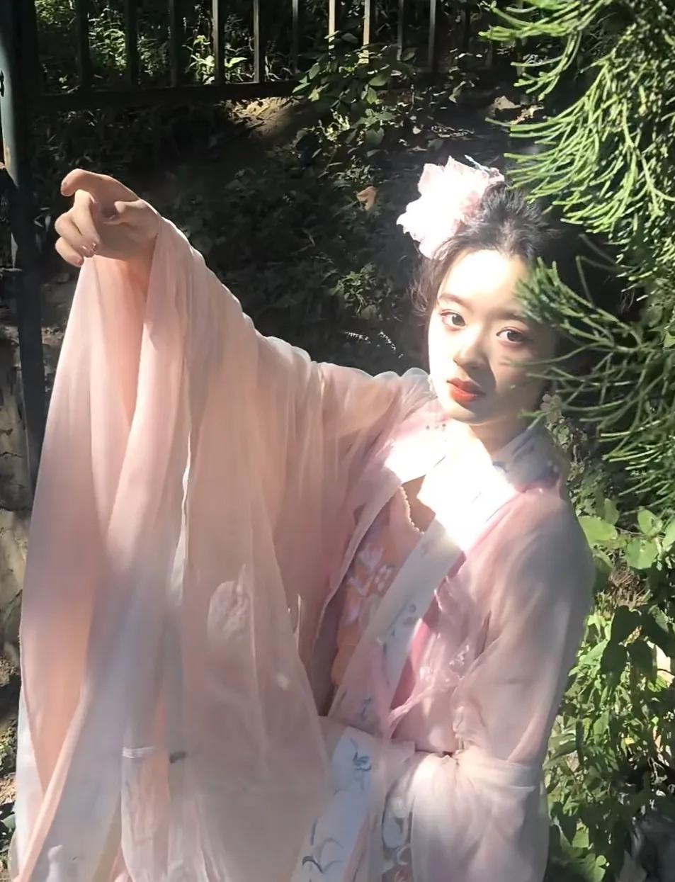 而穿粉色外套白色内搭时,又显得很纯就像少女。
