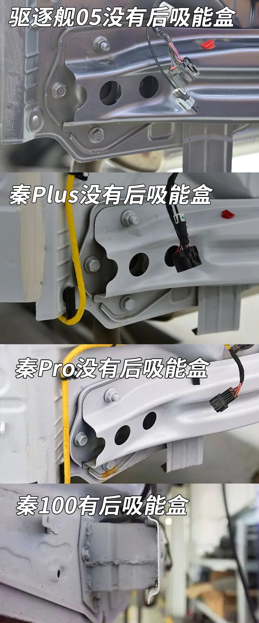 驱逐舰05没有后吸能盒,防撞梁与后尾板直接相连,中间没有缓冲措施。如果发生低速碰撞,容易造成尾板损伤,影响二手残值,而老款的秦100则有非常规矩的吸能盒。
