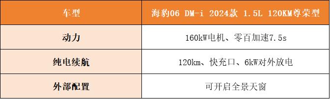 下面就是120km续航的车型,首先是海豹06 DM-i 2024款 1.5L 120km尊荣型,它比次低配贵了1万,多出来的东西包括40km的纯电续航、零百加速从7.9s提升到7.5s、提供快充口、6kW的对外放电和可开启的全景天窗。至于要不要选这个车型,就看各位的充电环境了。