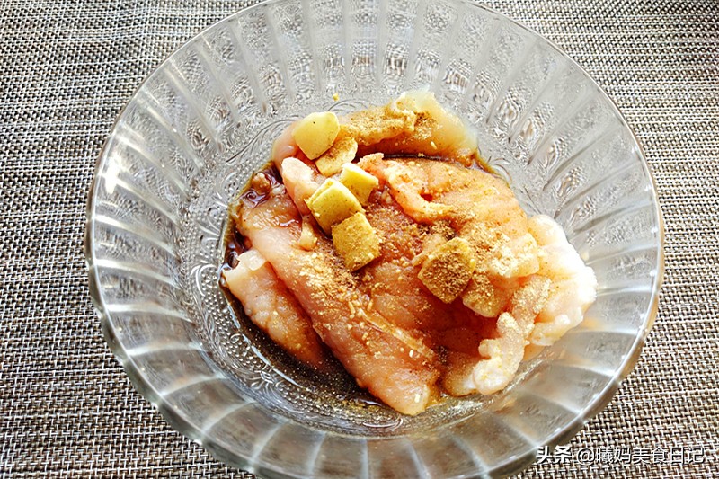 做法:1.腌制。将鸡胸肉片成两片,再切成肉块,撒少量的白胡椒粉、食盐,加一勺生抽和料酒,放入姜片,充分的抓匀腌制15分钟。