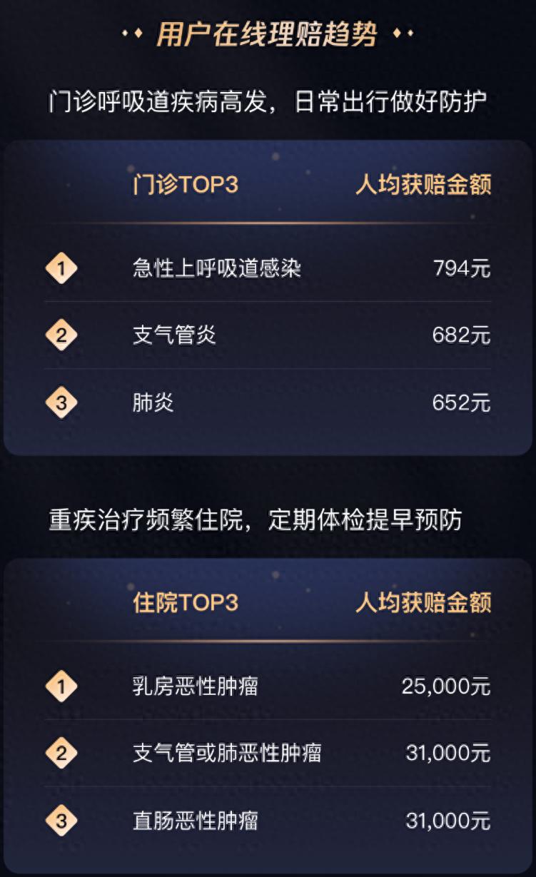 此外,报告还发布了微保用户在线理赔趋势,在过去一年中,门诊就医理赔前三疾病分别是急性上呼吸道感染、支气管炎、肺炎,人均获赔金额分别为784元、682元、652元;而住院就医理赔前三疾病分别是乳房恶性肿瘤、支气管或肺恶性肿瘤、直肠恶性肿瘤,人均获赔金额分别为25000元、31000元和31000元。