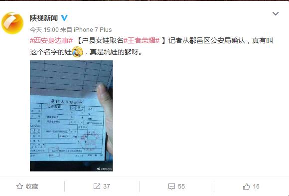 经陕西广播电视台记者从鄠邑区公安局确认,真有叫这个名字的娃。有媒体评论称,这家人王者中毒有多深啊,孩子长大了和你们没完,坑大了!