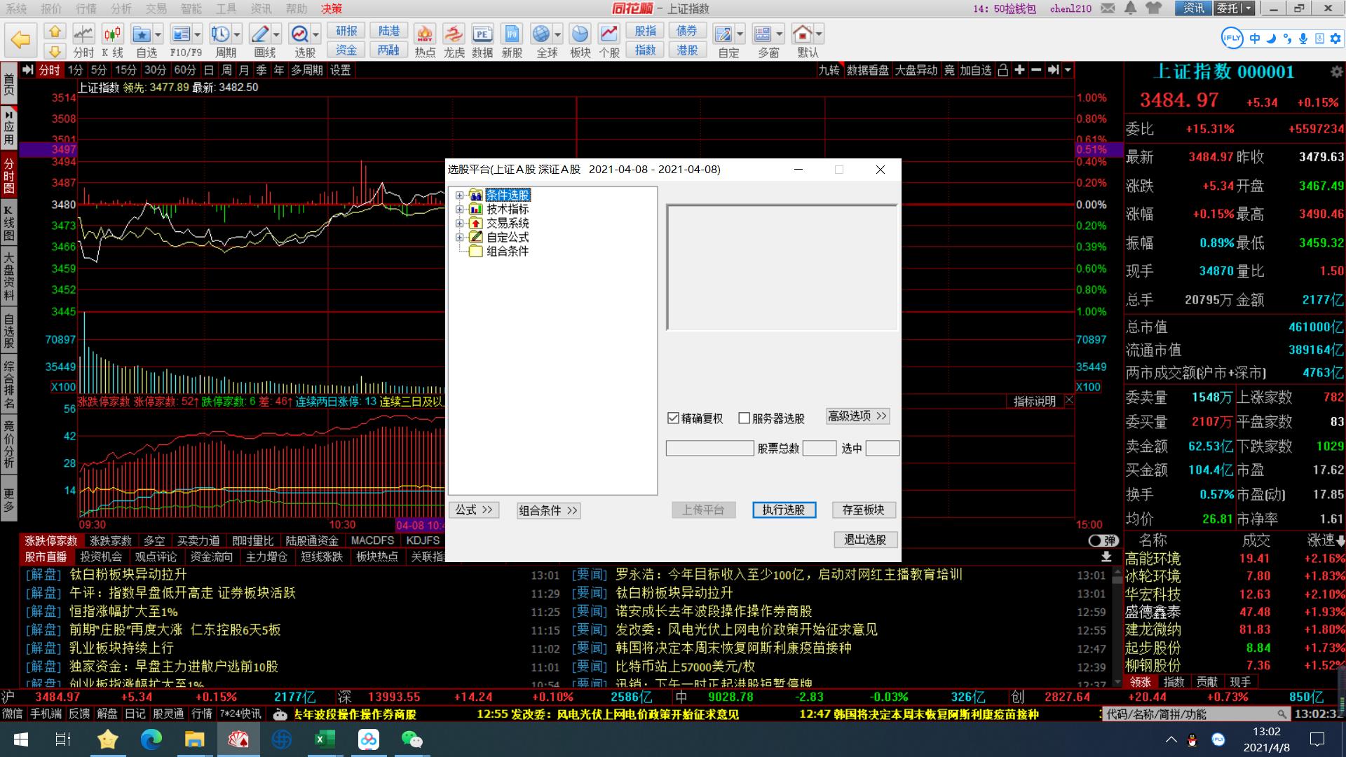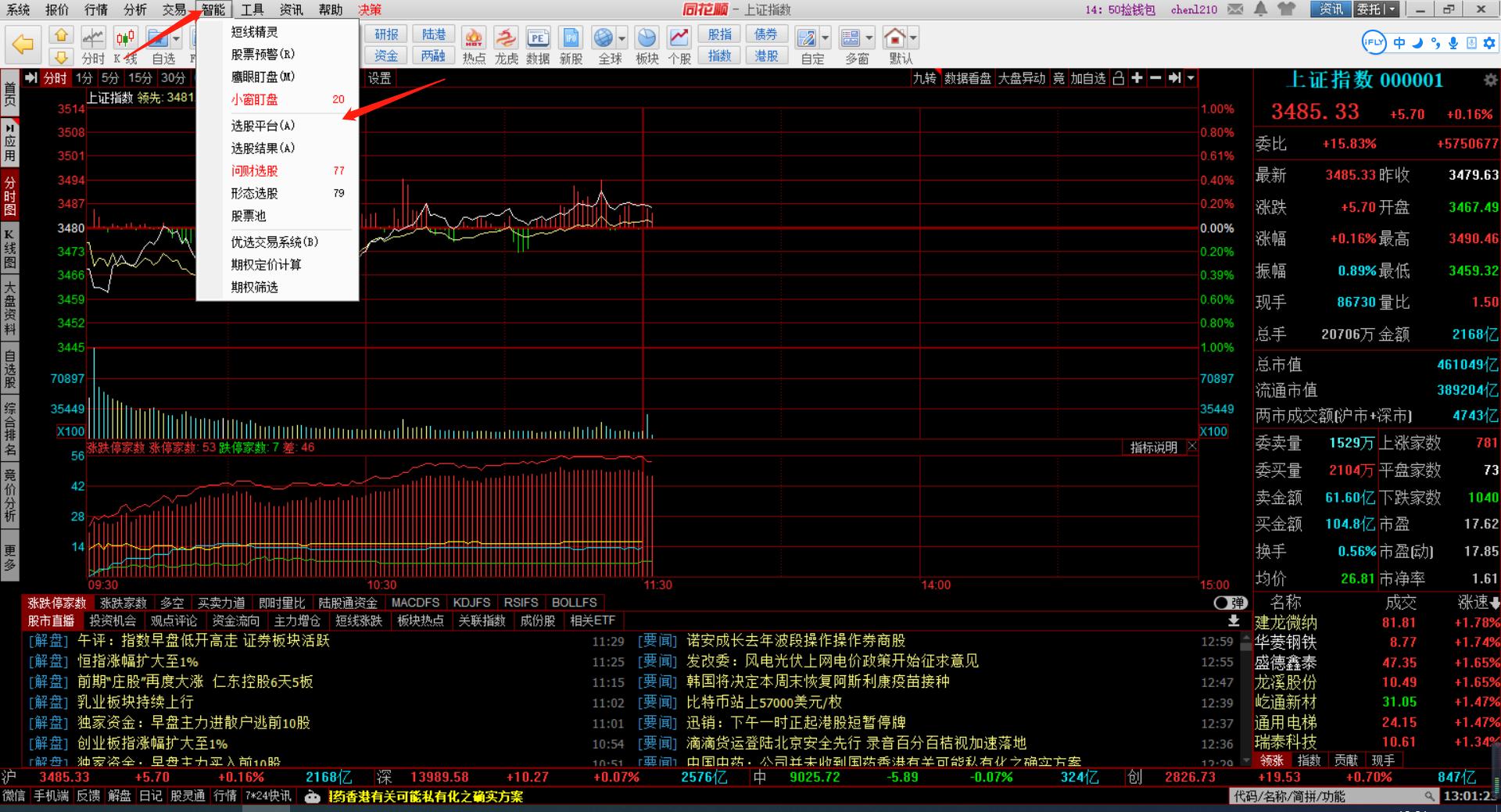 条件选股:里面包含:盘中预警、K线选股(连续N日收阳线、N日内创新高)、指标选股(macd、kdj)、财务选股(巴菲特的选股策略)、综合选股、行情选股、自定选股