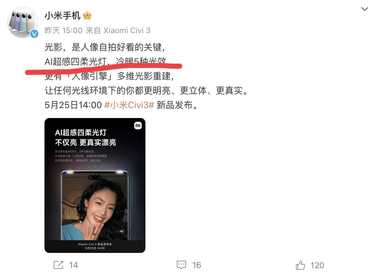 大家都知道,Xiaomi Civi定位就是轻薄、自拍,自研的美颜算法友商不同,不会对用户的脸部等部位进行过度的磨皮和美化,始终保持最真实的面。在历经三年的技术累积之后,小米Civi 3再次将算法提升,在产品设计上有了属于自己的语言,实现了盲从到超越的进步。