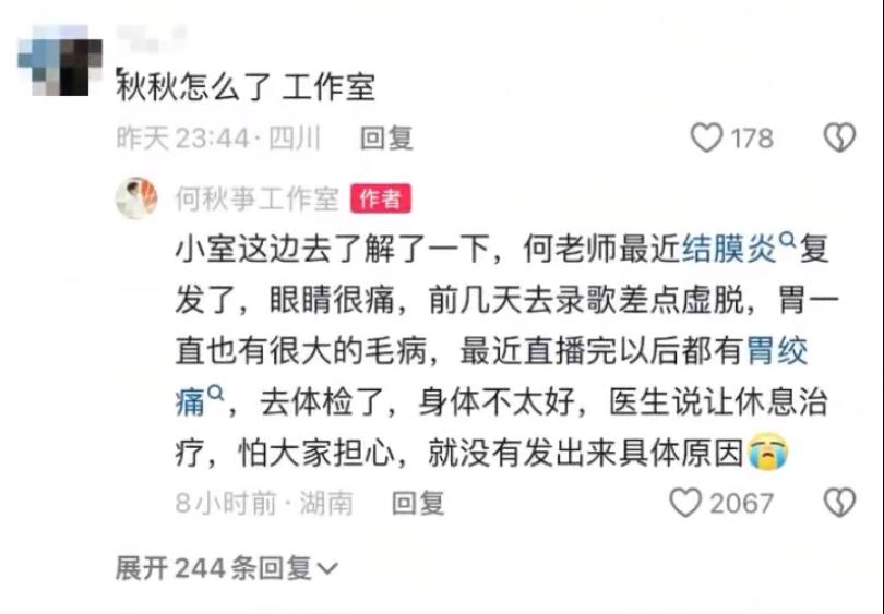 对于何秋亊无限期停播的原因,他的工作室给出的解释是近期何秋亊结膜炎复发,眼睛很痛,前几日录歌差点虚脱,胃一直有很大的毛病,最近直播结束后经常胃绞痛,去医院检查后发现身体状态不太好,医生建议休息治疗。