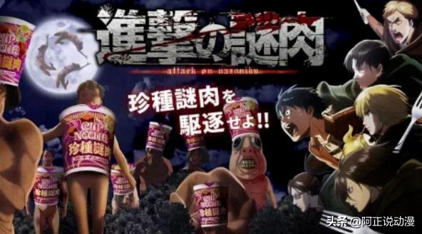 最奇葩的还是我们上次聊过一次的日清杯面广告,专门找《巨人》进行联动,合体出了一个奇怪的东东《进击的迷肉》——