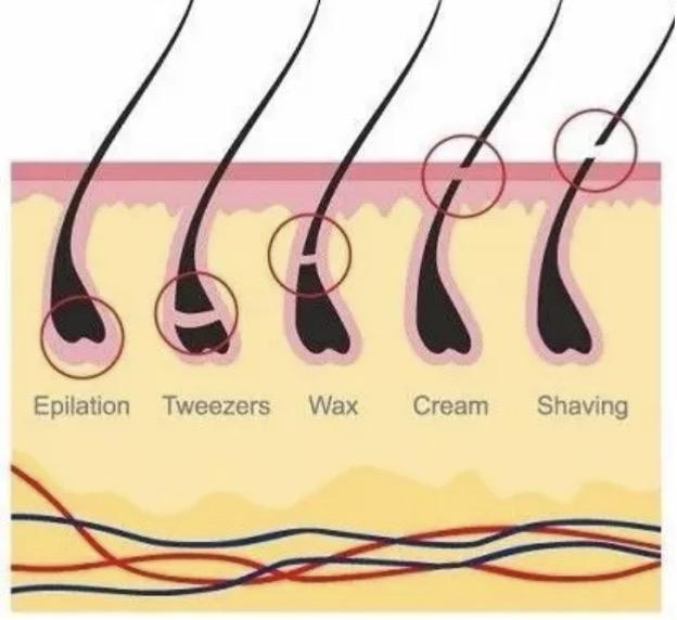 对于上述方式在毛发中的不同靶点如图所示:从左至右依次是激光脱毛的最佳靶点、镊子、蜜蜡、脱毛膏、剃毛刀。