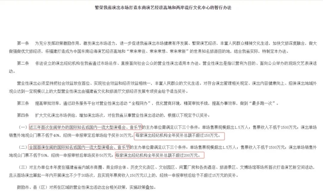 这还不够。10月8日,福建省文化和旅游厅还出台了演出市场奖补办法,重点扶持首次来闽、全国首演等演出项目,单家演艺机构来福建举办演唱会、音乐节,最高可获奖补350万元!