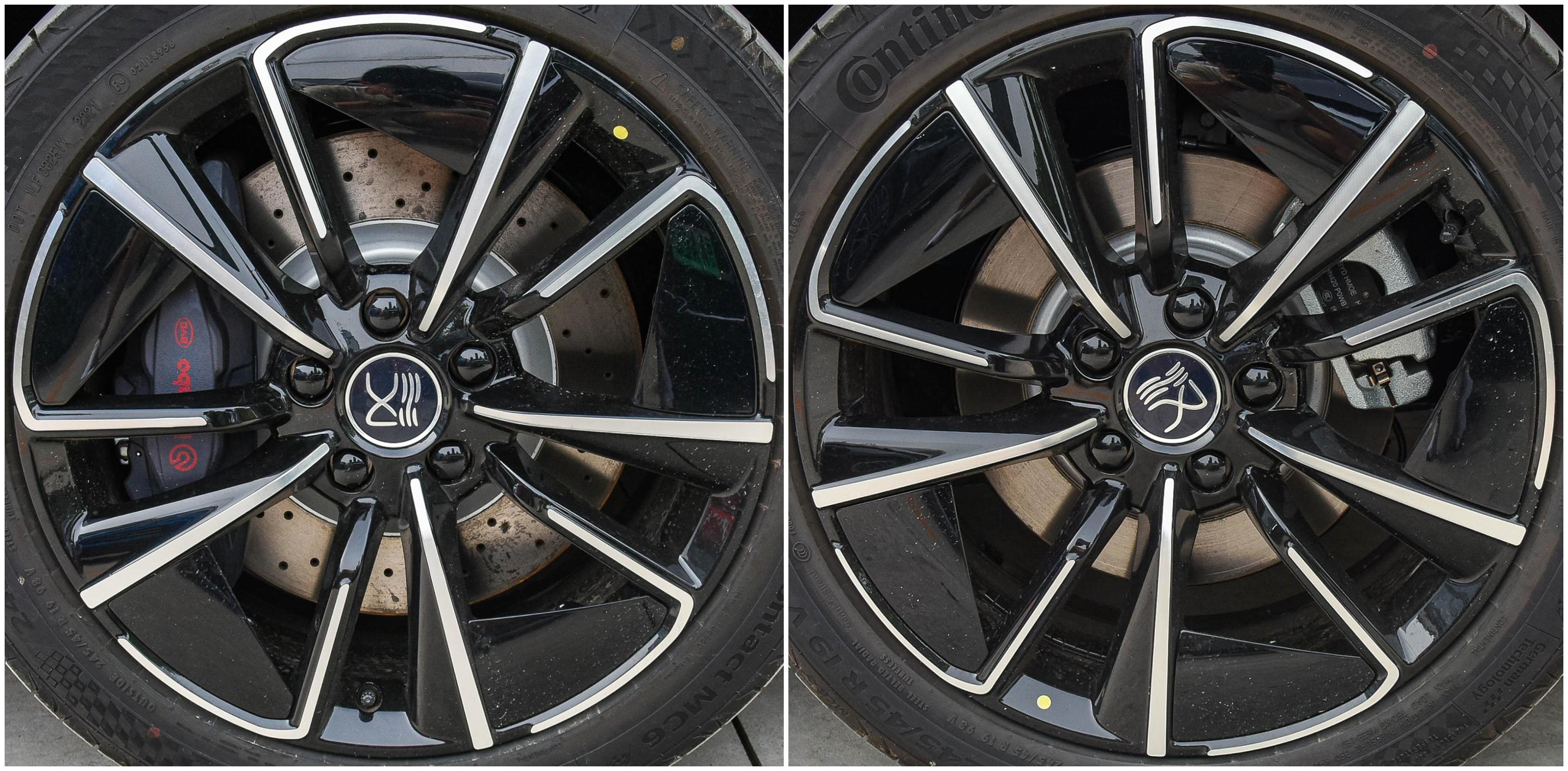 22款 610KM四驱千山翠限量版的前刹车盘使用通风盘式打孔刹车盘+高性能石绿四活塞刹车卡钳,后刹车盘使用实心盘式刹车盘+石绿色单活塞刹车卡钳;
