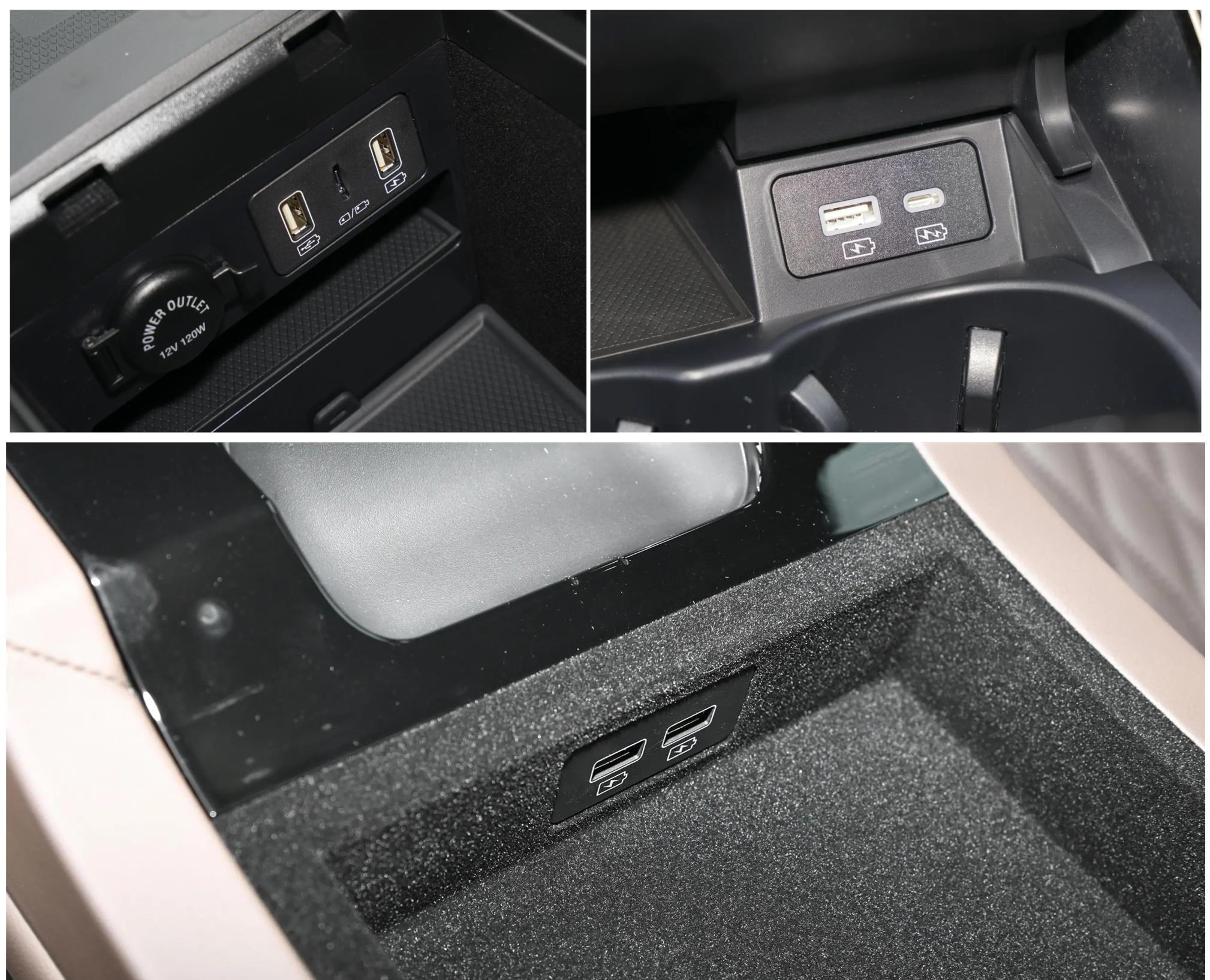 前排中央扶手箱内配备2个USB接口,1个Micro SD卡插口,前排中控挡把前方配备1个USB接口,1个Type-C接口;后排配备2个USB接口。