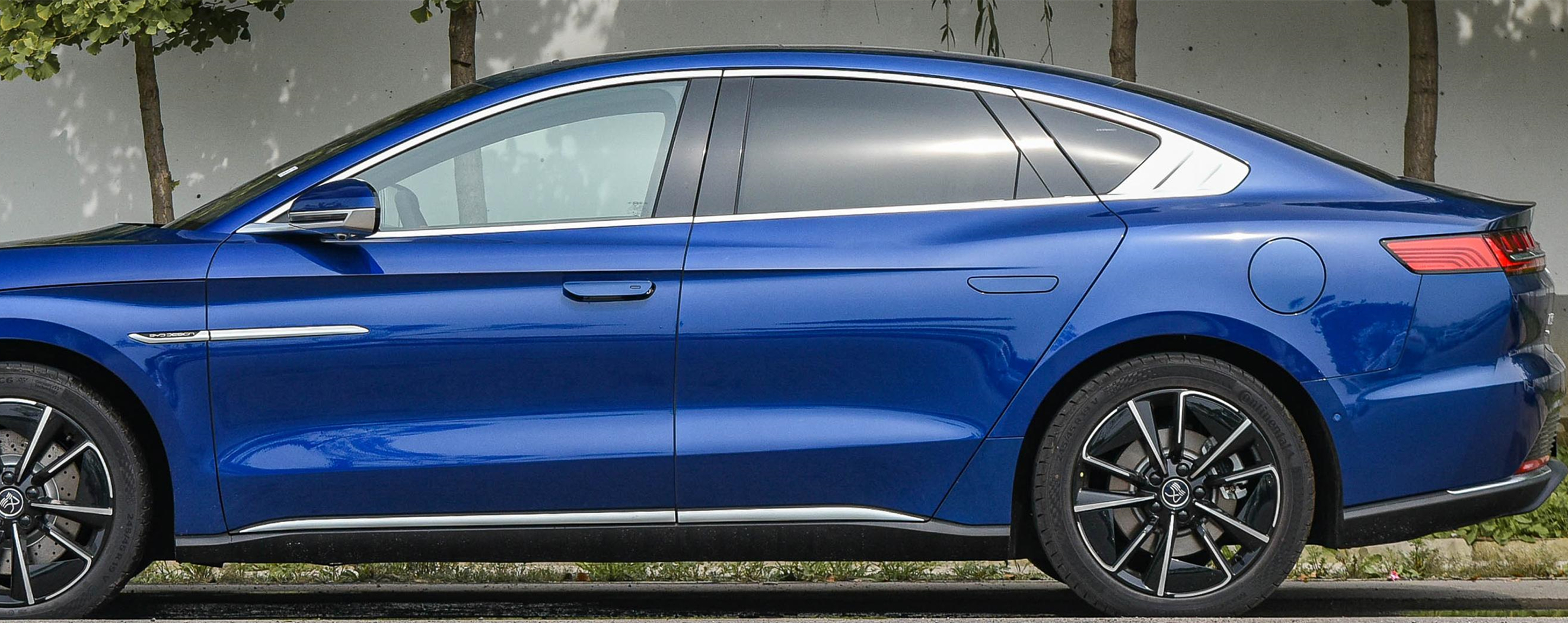 车侧,22款,21款和20款都使用了电动弹出式隐藏门把手,但22款弹出式门把手的“汉”是白字,而21款和20款弹出式门把手的汉则是黑字,此外就是轮毂造型有所差异,其它部分则无不同。