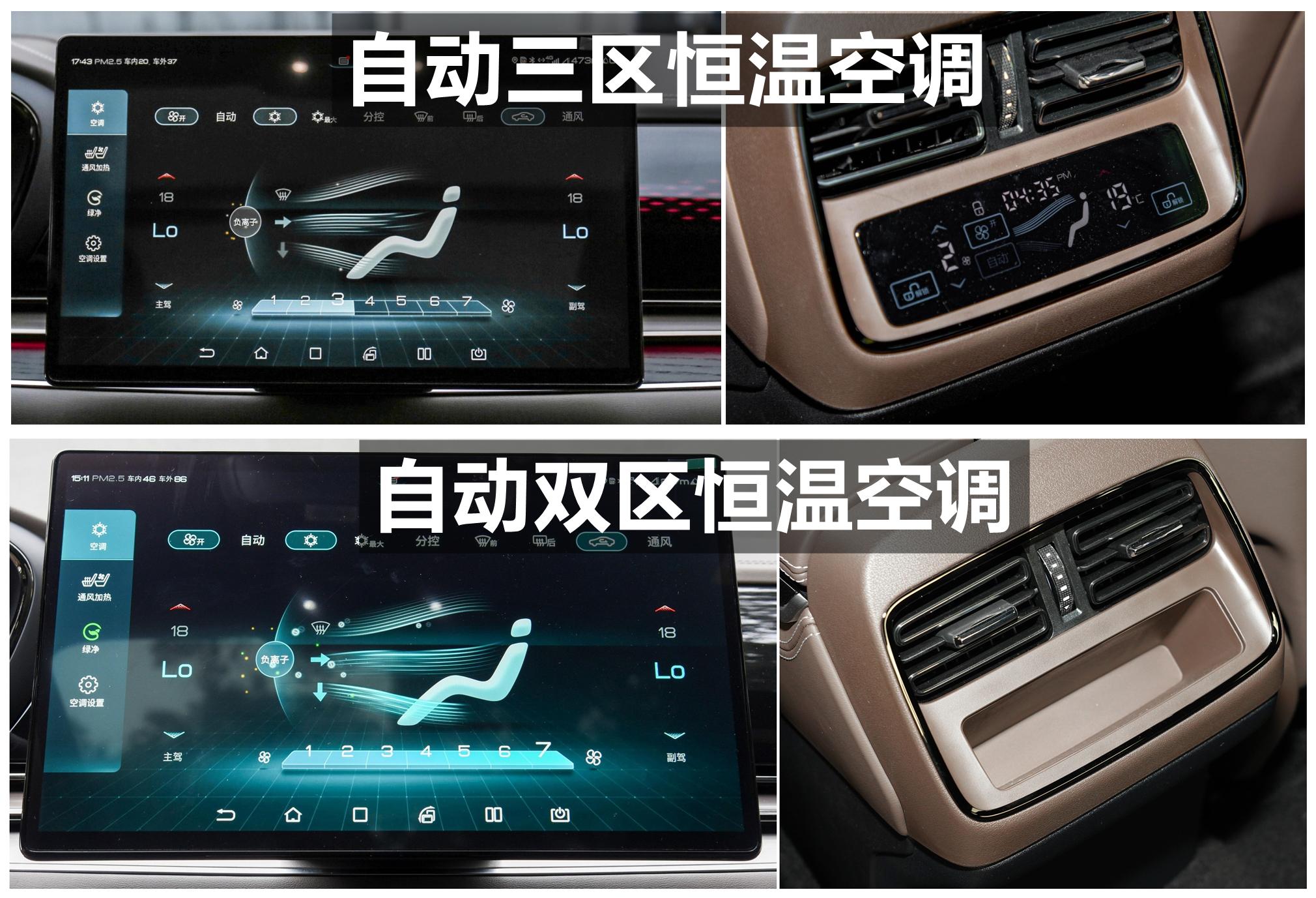 20款 超长续航版尊贵型和20款 四驱高性能版旗舰型配备自动三区恒温空调(热泵空调),后排带独立空调控制,22款 创世版 715KM尊荣型、22款 创世版 715KM旗舰型、22款 创世版 610KM四驱尊享型、22款 610KM四驱千山翠限量版、21款 标准续航版豪华型和20款 超长续航版豪华型则配备的是自动双区恒温空调(热泵空调)。