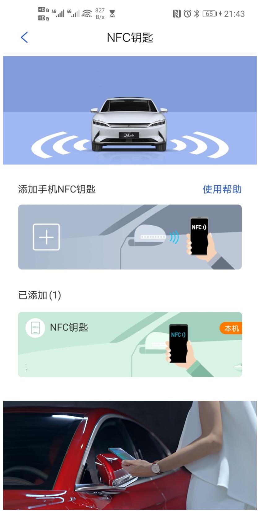 其中2022款所有车型还支持NFC钥匙功能,手机下载安装“比亚迪汽车”App,然后绑定NFC钥匙,即可将手机放到主驾外后视镜的NFC感应区,感应解锁车辆,注意需要手机支持NFC功能。