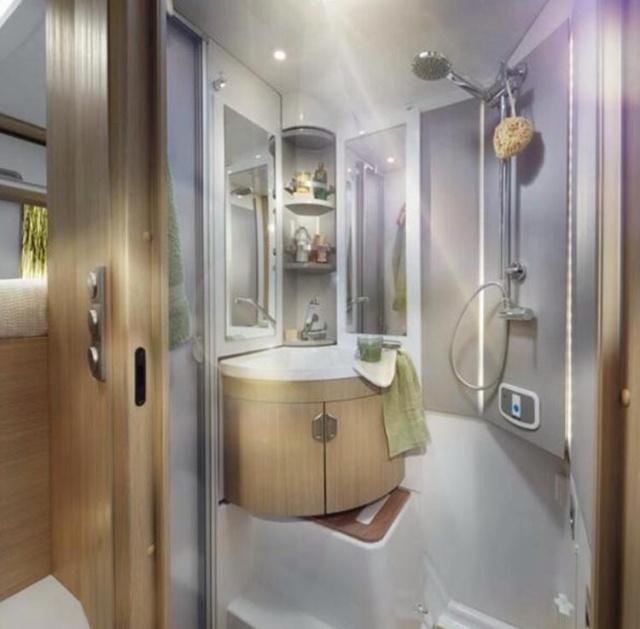 Smove的卫生间也非常有特色。并没有像其他房车那样留给卫生间的空间较小,相反的是Smove的卫生间空间相当的大,洗手池与马桶在设计上也进行了隐藏,旋转式身处,不用的时候可以将其收回,这样便有更大的空间可以用于洗浴。