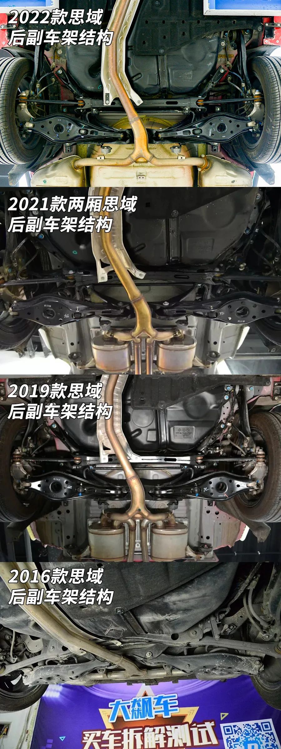 无一例外得到继承 这辆第十一代本田思域的底盘基本上与之前几代思域没什么本质变化。依旧是H形前副车架配麦弗逊前悬,全框式后副车架配常见的“三横一纵”四连杆。无论是底盘隔热缺失,还是管线外露,没有树脂喷涂,甚至是新车底盘生锈等诸多问题,在十一代思域身上无一例外都得到了“继承”。 那么关于这辆车的内饰又会如何,这辆全新一代思域值不值得买呢?还请继续关注后续的拆车内容。(本文及视频中的测量数据结论观点仅对此辆车负责,测量数据对公示的实验方法负责。)