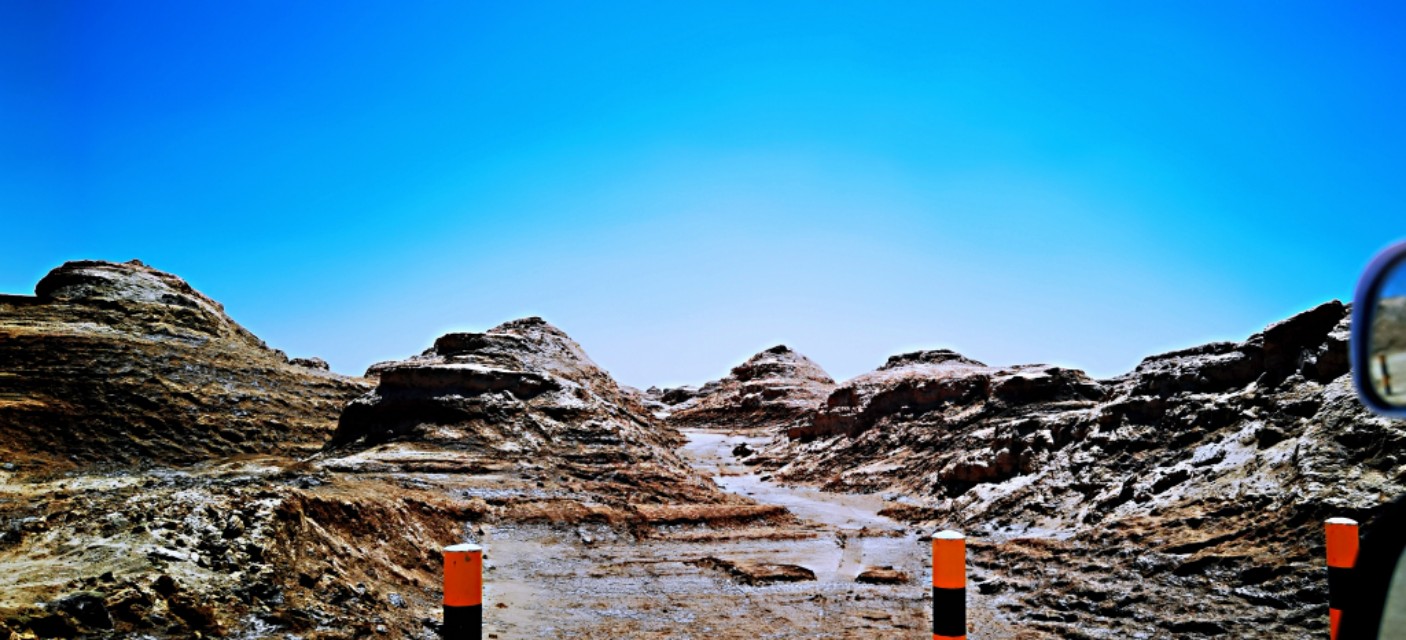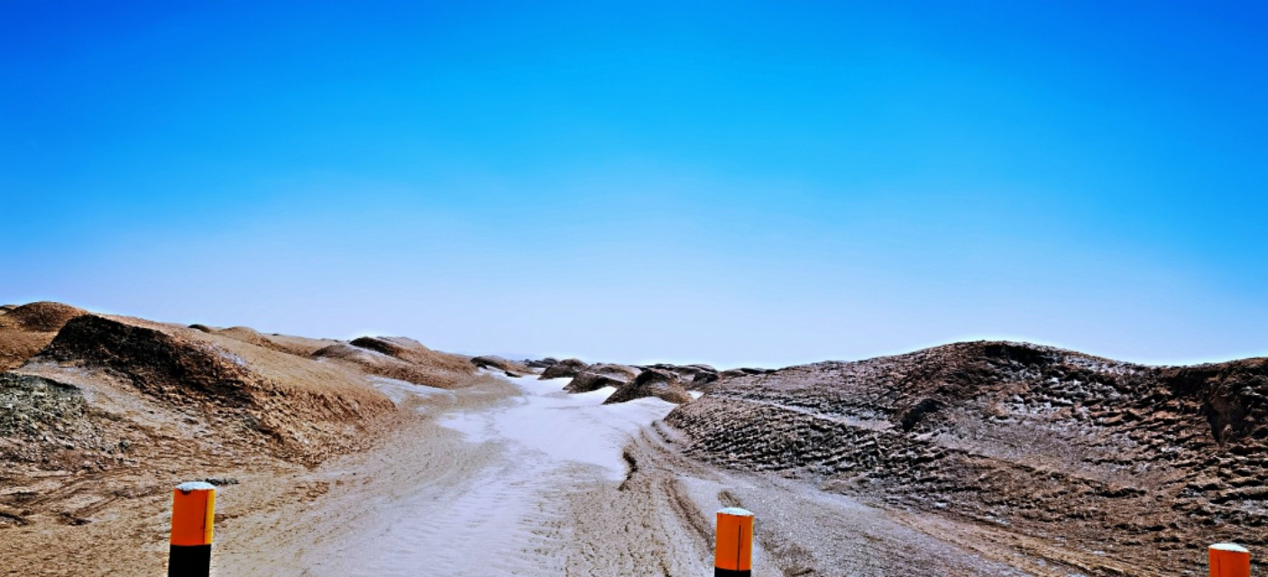 从火星一号公路0起点处设置导航去往火星营地,总计里程80公里多点,全部是盐碱地路面,其中,火星一号公路占了大部分,大概有66公里多点,剩下十多公里是一条无名公路,据说遇上下大雨整个道路就成了断头路,随处都可能陷车,几乎所有车辆都无法通行了。