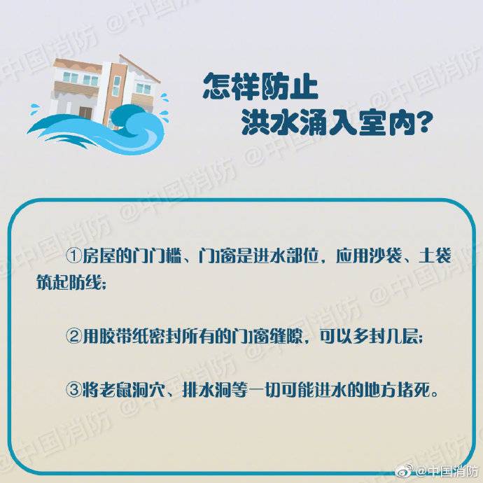 6、洪水来得太快,已经来不及转移时,要尽量利用一些不怕洪水冲走的材料,如沙袋、石堆等堵住房屋门槛的缝隙,减少水的漫入,或是躲到屋顶避水。