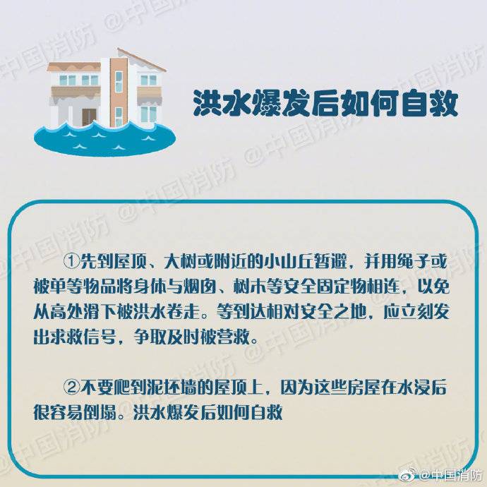 2、洪水来得太快,已经来不及转移时,要立即爬上屋顶、楼房高屋、大树、高墙,做暂时避险,等待援救,不要单身游水转移。