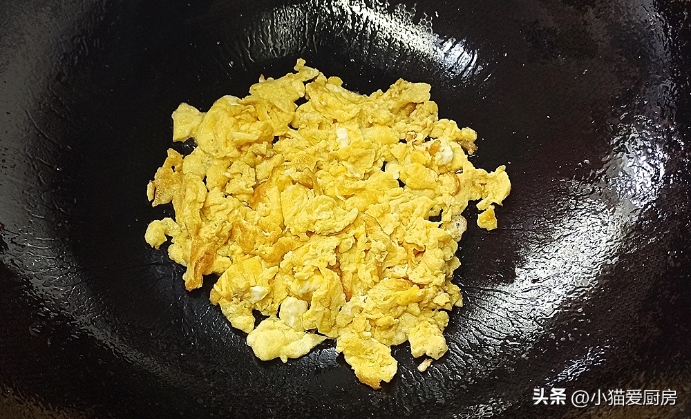 【步骤三】:锅中放油烧热,把鸡蛋倒入锅中炒熟,剁成小块盛出来备用。