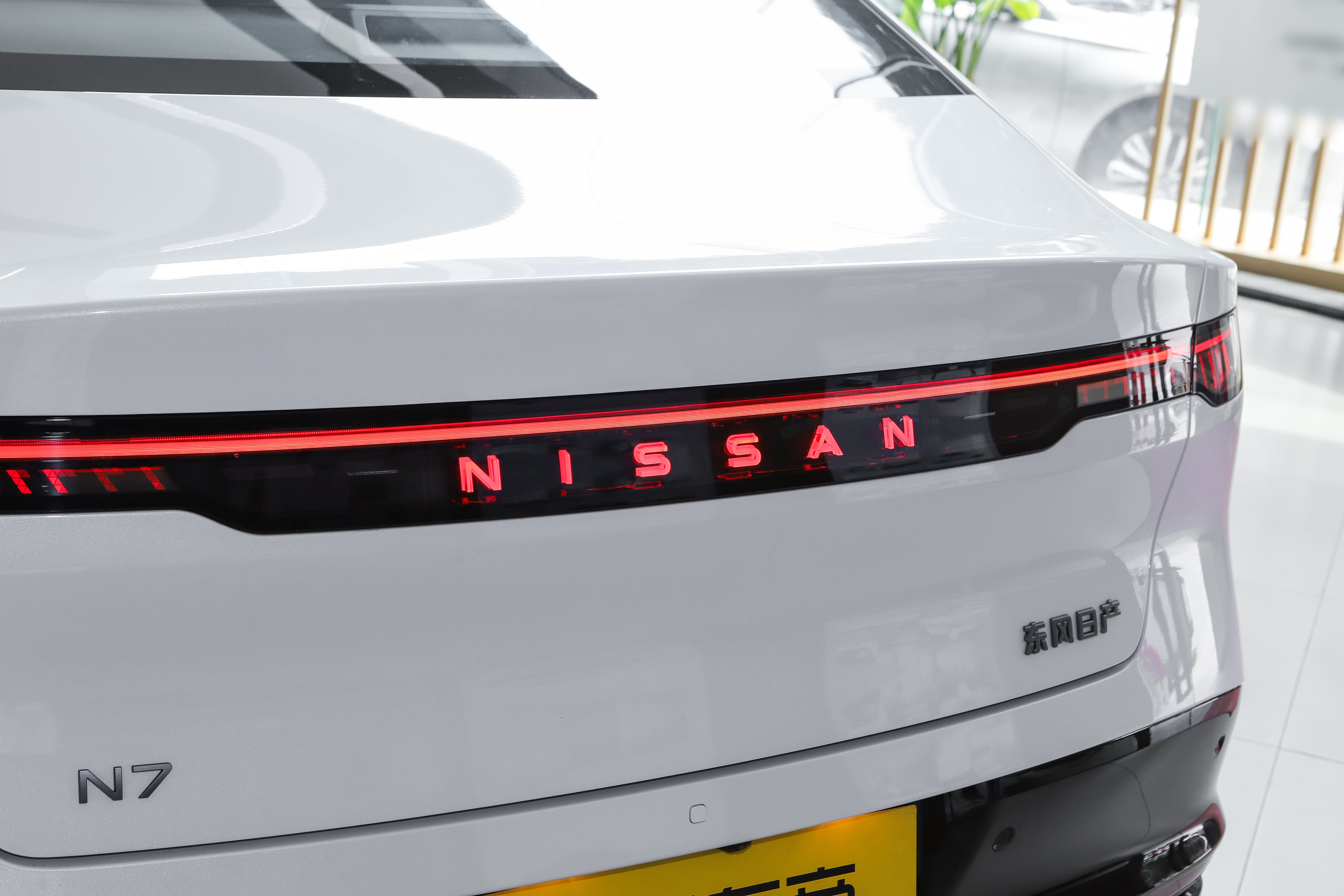 车尾部分,东风日产N7采用细长造型贯穿式尾灯,尾灯中央融合了NISSAN英文车标,具有多种点亮效果。另外,新车还采用黑色后包围。