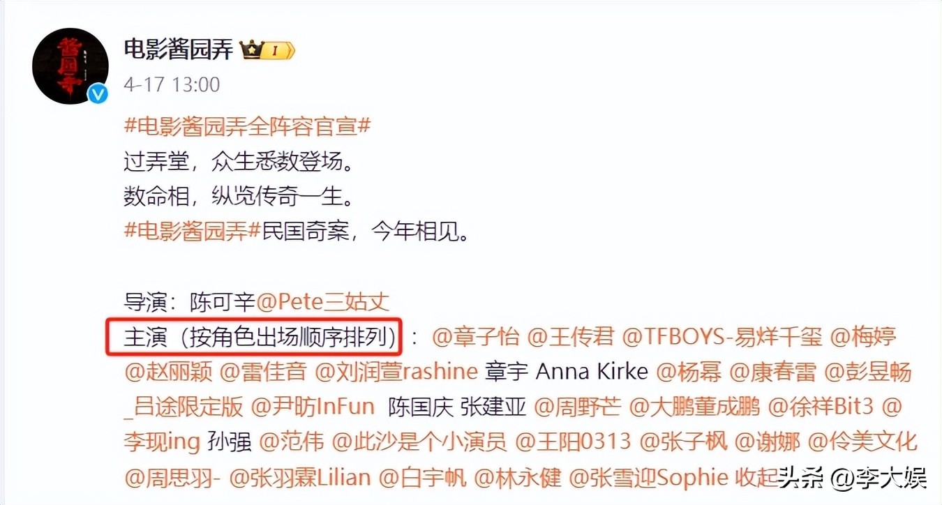 或许是为了避免粉丝撕番,《酱园弄》官宣全阵容时,并没有按照戏份和番位顺序宣布,而是按照剧中角色的出场顺序给演员排序,如此安排让各家粉丝都无话可说。除此之外,陈可辛携《酱园弄》亮相北京电影节,那么多大牌明星,居然一个人都没带,导演一人走红毯简直不要太凄凉。