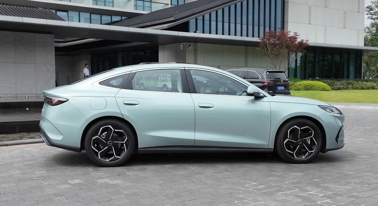 首先看外观,大部分人肯定不会一上来就奔着高配去买,毕竟它最大的噱头是9.98万的中型车嘛,所以最便宜的车型表现如何很重要。首先从正脸看,入门款与顶配车型相比也没啥差别,这一点值得点赞。不过到了侧面就能看出差异了,它有三种不同规格的轮毂,分别对应低中高配车型。9.98万的入门款采用的是16寸轮圈,对于一台中型车来说略小,但比亚迪下了心思,它的颜值还不错。预算不够设计来凑嘛,熏黑的五幅条风格跟很多跑车性能车的轮毂很相似,它巧妙的避开了自身的缺点,跟车身融合的蛮好。