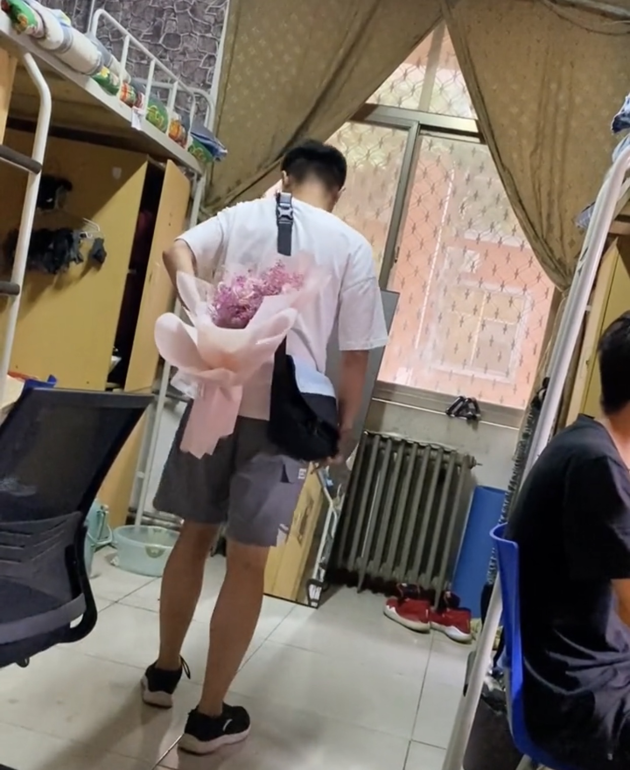 该男生对着镜子,模拟送花的场景:把花藏在身后,时不时调整站立的位置,接着右膝跪地,将花送出去。他的室友将他这可爱认真的模样拍了下来,称为了给他的女朋友送花,他在宿舍对着镜子演练了一早上。
