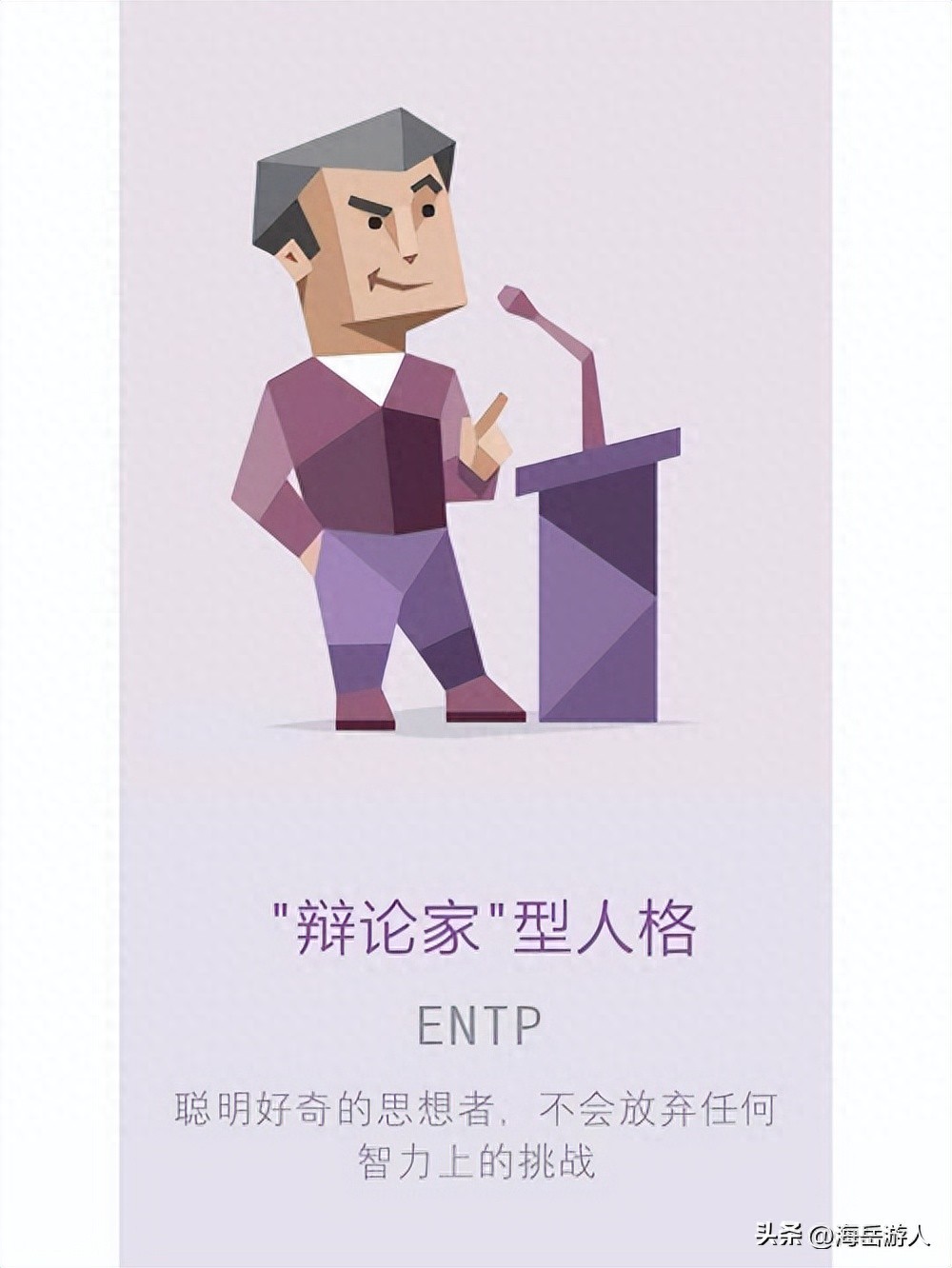 你有没有遇到过这样的人,他们思维敏捷,创意无限,喜欢挑战和辩论,对任何事情都有自己的见解和想法,而且总能说服别人接受他们的观点?他们就是 ENTP 人格类型,也被称为发明家或辩论家。他们是人群中的佼佼者,引领时代的先驱,但是他们也是最“可怕”的人格类型,为什么呢?