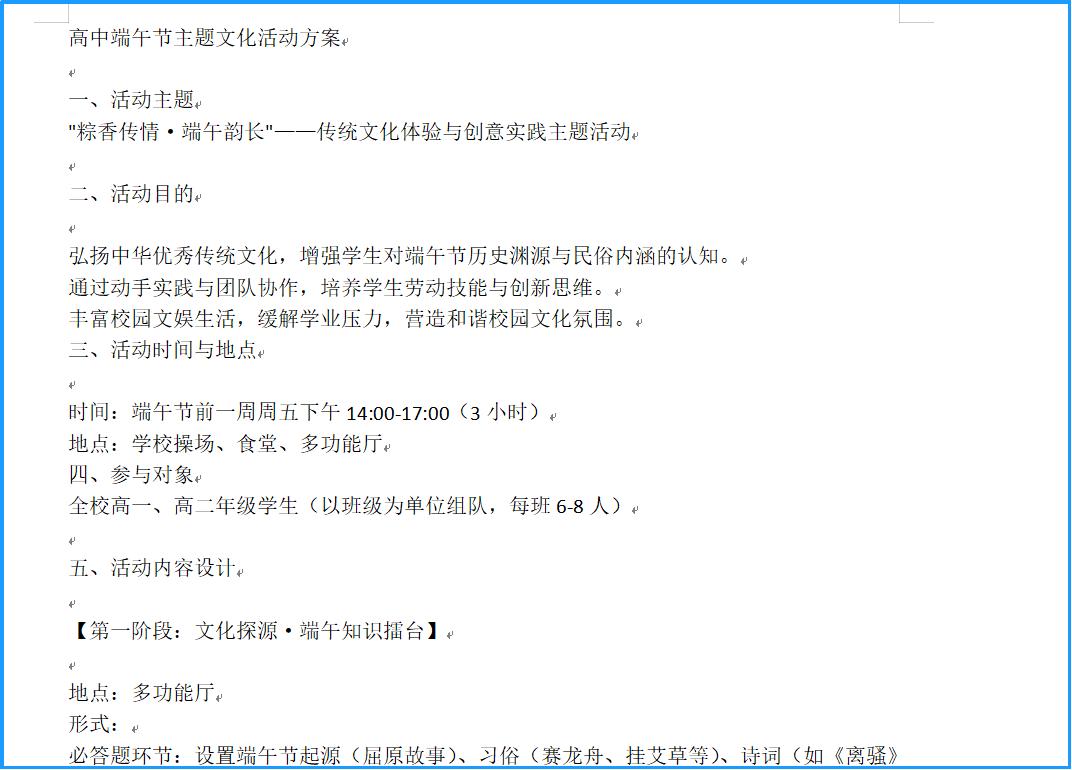 写个高中的端午节活动方案,1000字左右。格式和排版要求如下:1、标题字体为方正小标宋简体二号,居中对齐,不设置加粗。2、一级标题字体为黑体三号,不设置加粗。3、正文字体为仿宋三号,对齐方式为两端对齐,首行缩进两个字符。 全文的段前段后距都是0行,行间距为28磅值。用html的格式输出,需要有能直接下载word文档的功能按钮,按钮放在页面上方,并且能直接下载word文件,下载的word文件中不要包含这个按钮了。