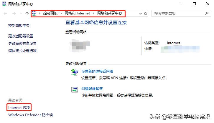 1. 首先,在控制面板中打开“网络和共享中心”窗口,找到左下角的“Internet选项”,点击