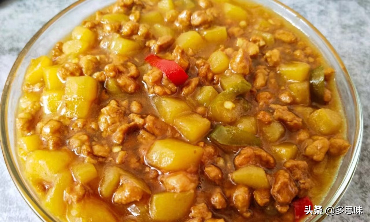 2、炒锅放油烧热,倒入肉末煸炒均匀,倒入土豆丁翻炒均匀,放小米椒,生抽2勺,老抽1勺,蚝油1勺,盐少许,白糖一点点翻炒均匀,加两碗清水,小火焖至汤汁收浓,淋入少许水淀粉勾芡即可出锅,好吃的拌饭酱就做好啦,用了拌面条也特别棒哦。
