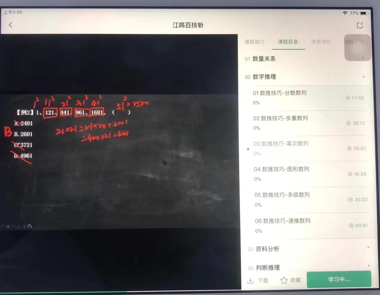 对于数量关系的学习,我就是跟着江神的脚步,一点点学行程、排列、工程、溶剂等简单的题型,对应的公式、解题步骤也都通过我课下的练习,运用得炉火纯青,本来就能写1、2道题,听完之后,一半儿的题都可以算出来。