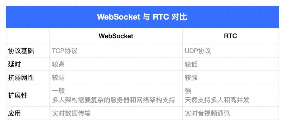 拓展限制:WebSocket 对于视频或多人交互场景显得“力不从心”。视频比音频使用更多的网络带宽,丢失和延迟的数据包也会更频繁;随着交互个体的增多,音视频流的发布和订阅管理也变得更加复杂。