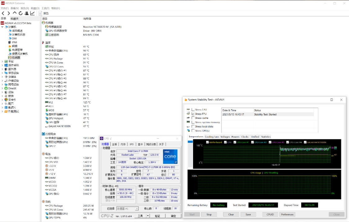 关闭AVX 512,将处理器OC到5.0GHz,烤机15分钟,CPU的温度稳定在90℃,功耗则维持在260W左右。继续单烤,功耗继续增加,并开始出现蓝屏,之后调整电压继续测试,结果也差不多。