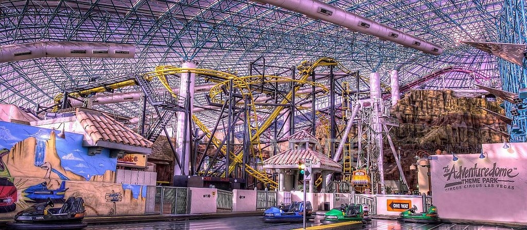 紧邻位于拉斯维加斯大道上的马戏团赌场渡假饭店,占地5英亩的探险圆顶是全美最大的室内主题遊乐场,场馆中全部采用中央空调,粉红色的圆顶下40多米高的沙岩峭壁与隧道、岩穴、瀑布,都忠实地反映出美国西南部峡谷的特色。并且这里全美唯一的双圆环、双螺旋设计的室内雲霄飞车,快来体验一下吧。