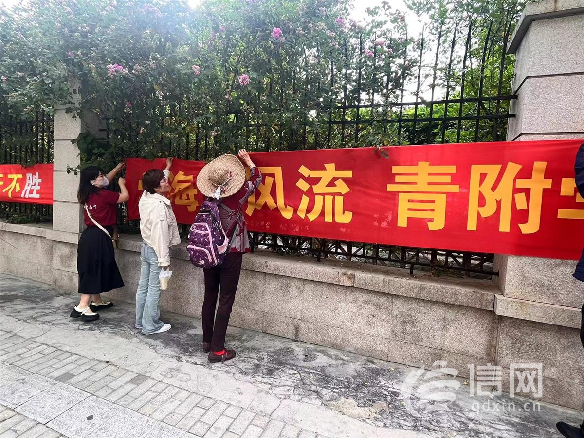 青大附中老师一早来挂横幅给学生加油,“老师们在考点门口左边等你们!”挂好横幅以后,老师在群里给学生发去信息。高三一班班主任丁老师早上六点半就来到了考点,该校有100名左右的学生在一中考试,老师们将全程在这儿陪伴。
